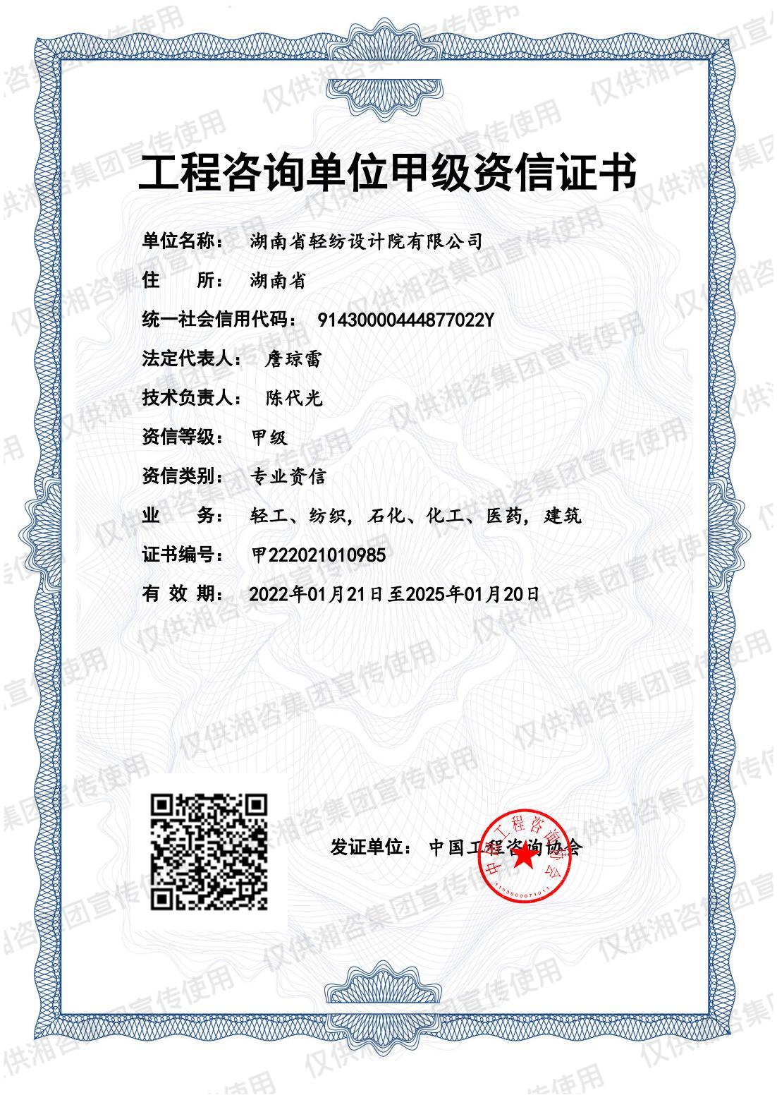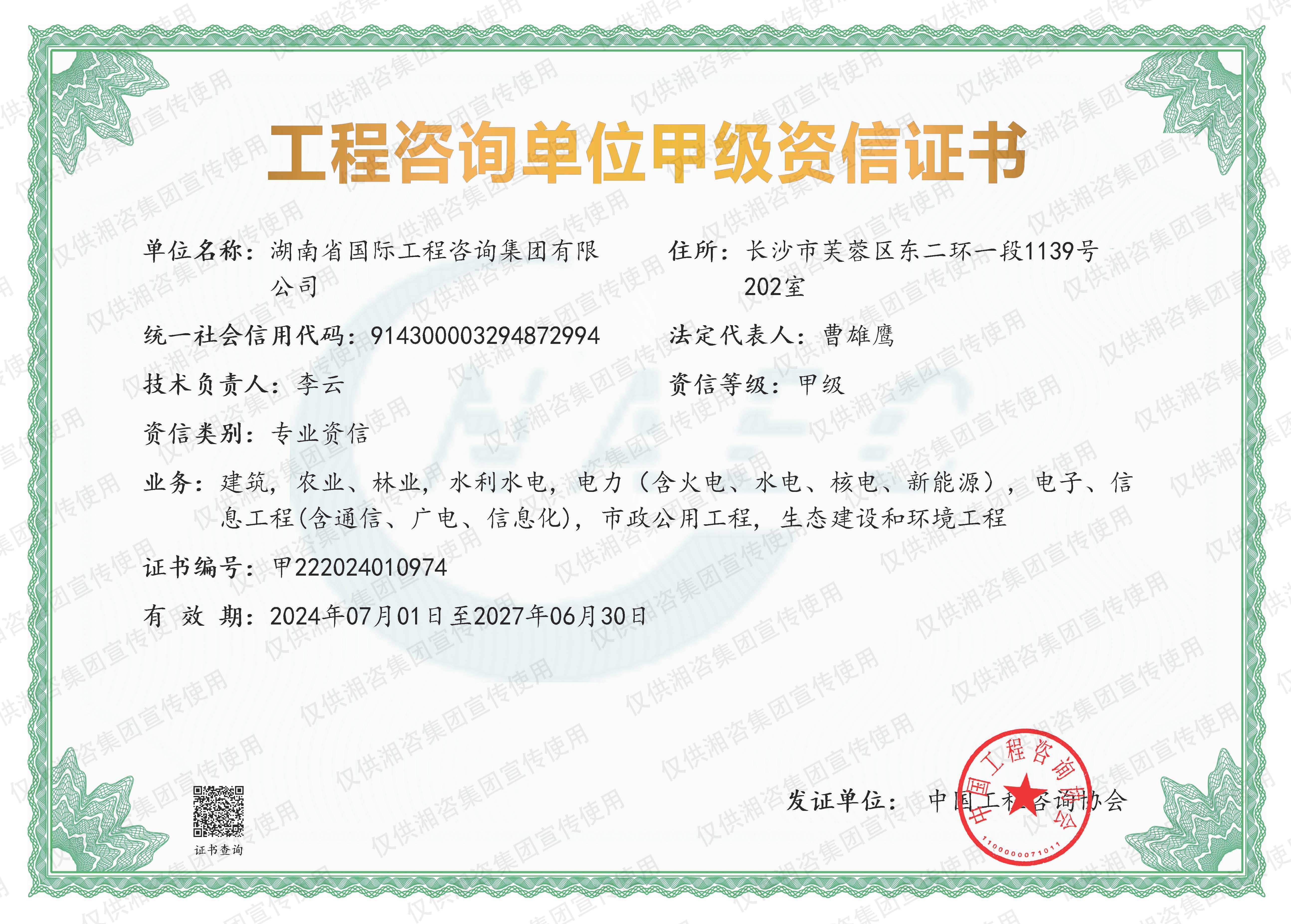 工程咨詢單位甲級資信證書-甲級