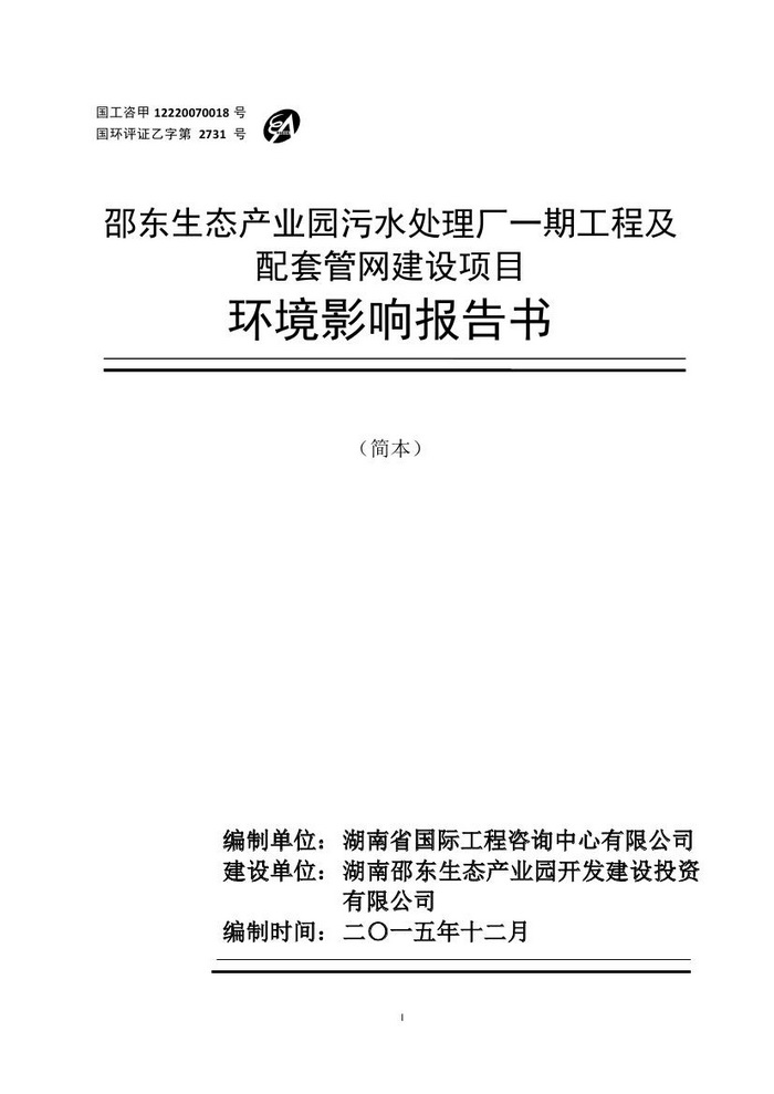 邵東生態(tài)產(chǎn)業(yè)園污水處理廠一期工程及配套管網(wǎng)建設(shè)項(xiàng)目環(huán)評(píng)報(bào)告書(簡(jiǎn)本)