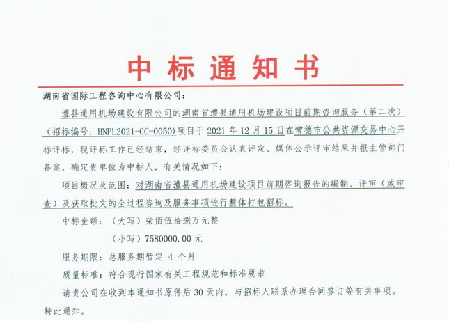 臨近歲末,捷報(bào)頻傳,省咨詢公司憑借突出的業(yè)績、雄厚的技術(shù)實(shí)力以及良好的市場信譽(yù),在眾多競爭對(duì)手中脫穎而出,成功中標(biāo)《湖南省澧縣通用機(jī)場前期咨詢服務(wù)》項(xiàng)目。