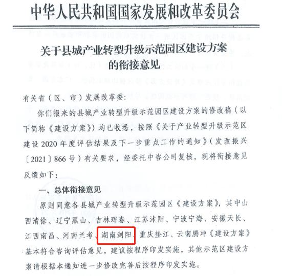 根據(jù)《國家發(fā)展改革委 科學技術部 工業(yè)和信息化部 自然資源部關于產(chǎn)業(yè)轉(zhuǎn)型升級示范區(qū)建設2020年度評估結果及下一步重點工作的通知》(發(fā)改振興〔2021〕866號),瀏陽經(jīng)開區(qū)成功入選國家級縣城產(chǎn)業(yè)轉(zhuǎn)型升級示范園區(qū)?!斗桨浮繁皇“l(fā)展改革委、省科技廳、省工信廳和省自然資源廳聯(lián)合印發(fā)。