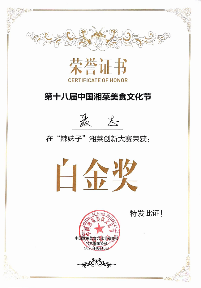 湘菜出湘,京城飄香。9月10日,由湖南省人民政府駐北京辦事處、湖南日?qǐng)?bào)社、湖南省商務(wù)廳和長(zhǎng)沙市人民政府聯(lián)合主辦的第十八屆中國(guó)湘菜美食文化節(jié)在北京盛大舉行。此次中國(guó)湘菜美食文化節(jié)共有60余位選手參賽,湘咨集團(tuán)下屬北京澤相苑大酒店以主打菜品“攜手共進(jìn)”參賽,榮獲此次大賽的最高獎(jiǎng)項(xiàng)--白金獎(jiǎng)。