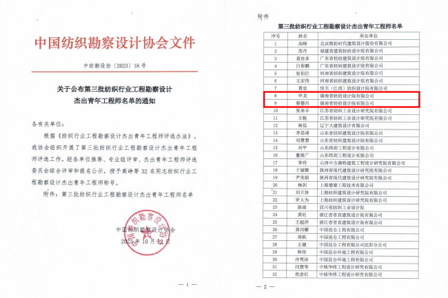 近日,中國紡織勘察設(shè)計(jì)協(xié)會正式公布了“第三批紡織行業(yè)工程勘察設(shè)計(jì)杰出青年工程師”評選結(jié)果,湘咨集團(tuán)下屬省輕紡院申龍、蔡德昌2名專家榮獲“第三批紡織行業(yè)勘察設(shè)計(jì)杰出青年工程師”榮譽(yù)稱號。