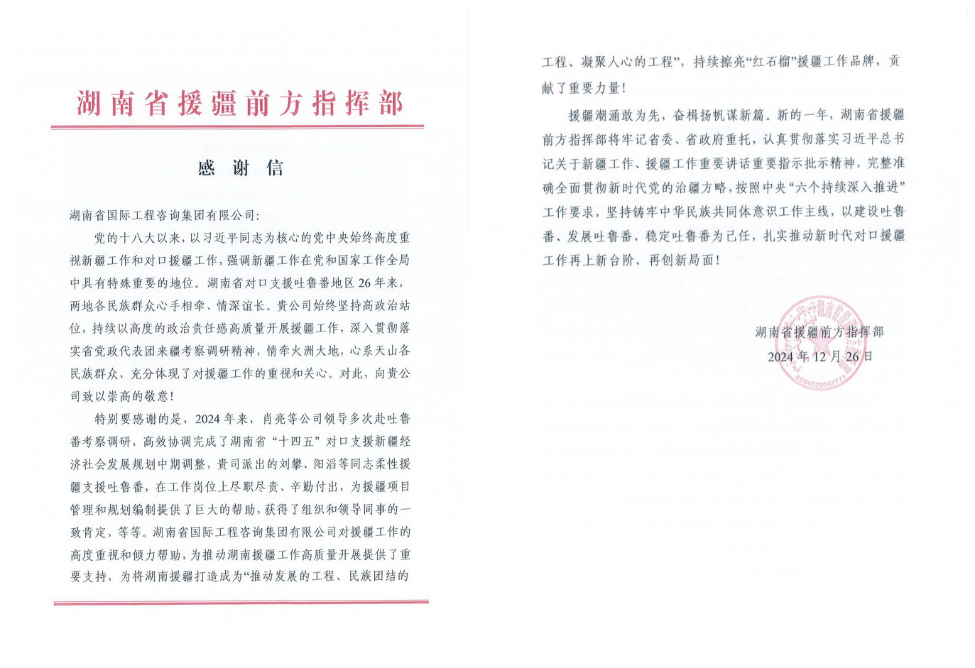 近日,湖南省援疆前方指揮部發(fā)來感謝信,對湘咨集團及副總經(jīng)理肖亮、工作人員劉攀、陽滔等同志在援疆工作中作出的貢獻表示感謝。 近年來,湘咨集團積極響應(yīng)黨中央關(guān)于援疆······