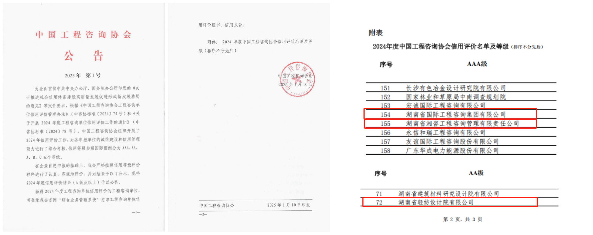 2025年1月10日,中國工程咨詢協(xié)會(下稱“中咨協(xié)”)發(fā)布2025年第1號公告,湘咨集團成功獲評2024年工程咨詢單位信用評價等級AAA級。據(jù)省咨詢協(xié)會統(tǒng)計,······